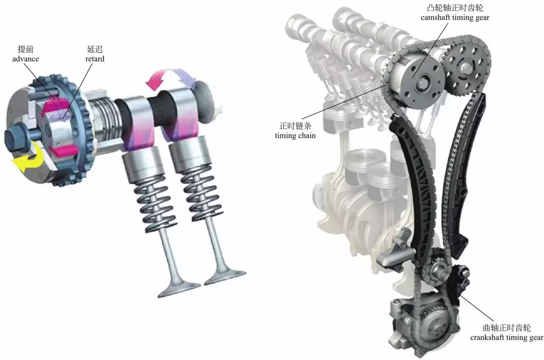 可变气门正时与可变气门升程 可变气门正时和可变气门升程可以根据发动机转速和工况的不同而进行调节,使得发动机在高低速下都能获得理想的进、排气效率。 可变气门正时 利用液压控制凸轮轴正时齿轮内部内转子,可以实现一定范围内的角度提前或延迟。