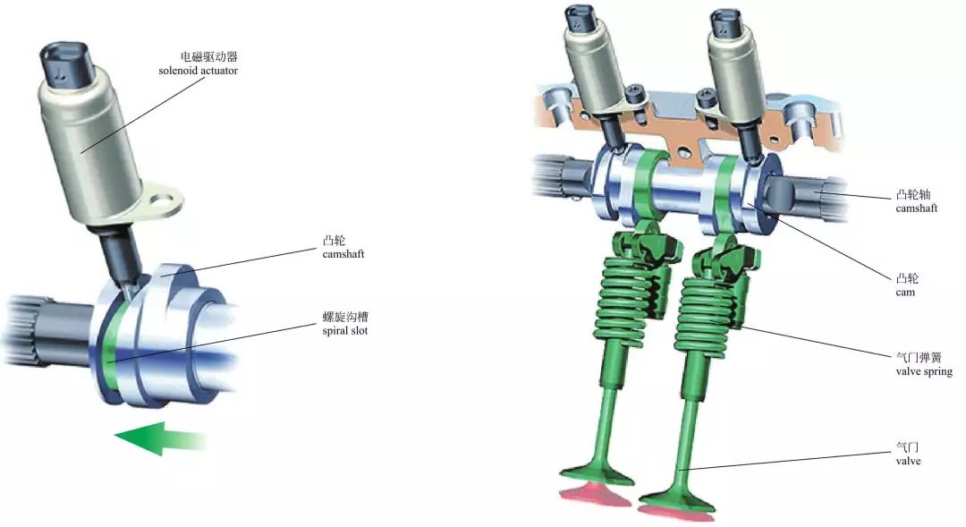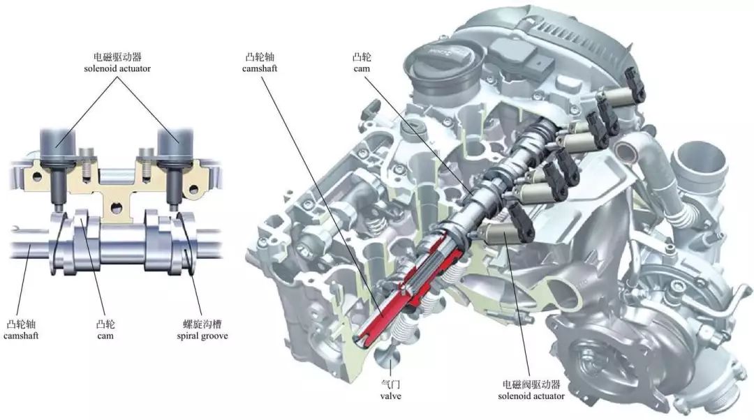奥迪气门升程系统 奥迪的AVS可变气门升程系统,主要通过切换凸轮轴上两组高度不同的凸轮来实现气门升程的改变,其原理与本田的VTEC非常相似,只是AVS系统是通过安装在凸轮轴上的螺旋沟槽套筒,来实现凸轮轴的左右移动,进而切换凸轮轴上的高低凸轮。在电磁驱动器的作用下,通过螺旋沟槽可以使凸轮轴向左或向右移动,从而实现不同凸轮间的切换。