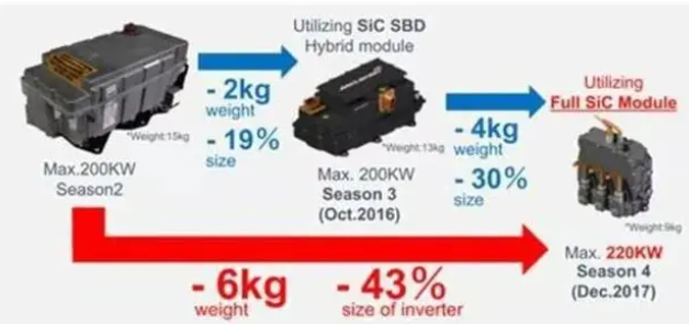 而使用 SiC 则大大降低了这一过程中能量损失,同时也可以大幅降低器件尺寸,车身可以设计得更为紧凑。