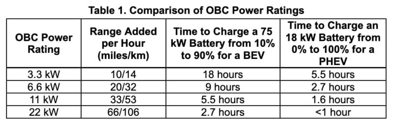 根据表 1,在车辆中安装大功率车载充电器具有显着优势。需要注意的是,OBC 的额定功率是电池可以从交流电源充电的最大功率,但实际输出功率取决于使用的交流充电器,以及壁式充电器本身可以提供的电压和最大电流。例如,如果充电器连接到 208 V 电压电源,并且具有额定电流为 50 A 的断路器,则该充电器可以提供 10.4 kW (208 V x 50 A) 的功率。这意味着需要 11 kW 的 OBC 才能充分利用可用的充电速度。