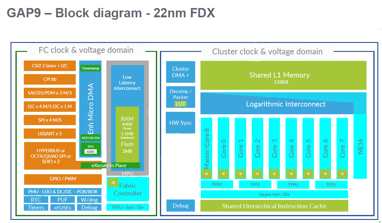 1. 10颗Risc-V内核,最高主频370MHz 2. 拥有AI加速单元:NE16, Neural Network Accelerator 3. 独立的电压域和时钟域,可根据使用场景灵活设置不同不主频 4. 3.7*3.7mm尺寸,可适用于更小尺寸的产品设计 5. 拥有多种外设接口,I2C,I2S,SPI,UART,HYPERBUS ,OCTA/QUAD SPI ,SDIO ,GPIO ,PWM等