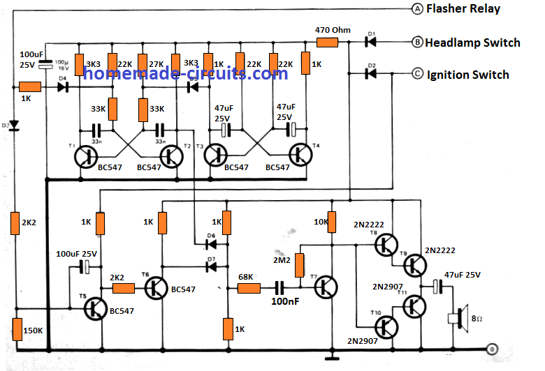 除此之外,一旦点火开关关闭,电路就会产生警告信号,但汽车前灯继续处于“开启”位置。该电路专为 12 伏负接地汽车设计。