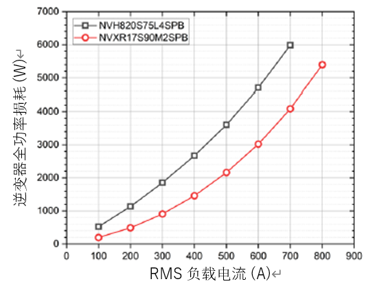 图 3 到图 6比较了 IGBT 效率与 SiC 效率。在图 3 和图 4中,NVH820S75L4SPB是 IGBT 模块(方形连线图),而NVXR17S90M2SPB是 SiC 模块(圆形连线图)。这两张图显示了 IGBT 因开关频率和 RMS 负载电流具有更高的功率损耗。图 5 和图 6 显示,以更高频率运行的 SiC 可实现出色的效率增益。