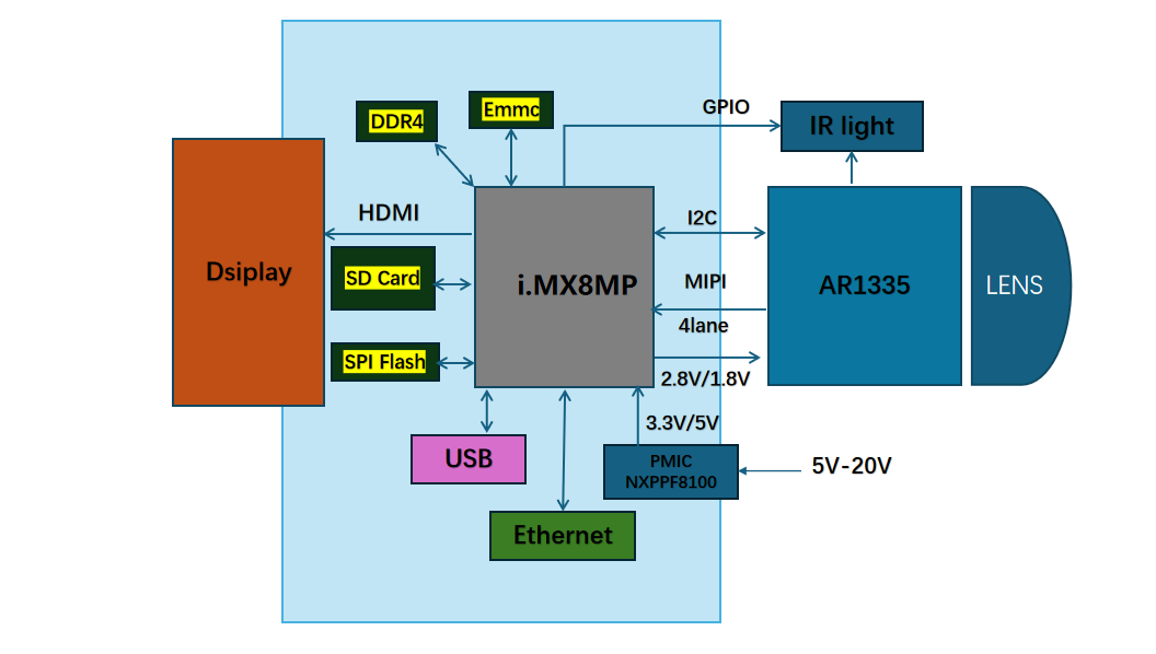 1.Soc:NXP i.MX 8M Plus 2.Sensor:Onsemi AR1335 3.Lens fov:120° 4.Lens Aperture: F2.5 5.Color Filter Array (CFA) : color 6.Module Data Transmission : 10 bit MIPI, 4−lane 7.Module dimension:32mm(W) *46mm(H)*22.47mm(D) 8.Frame rate: 30fps(4096x2160),120fps(1080P),30fps(1080P)