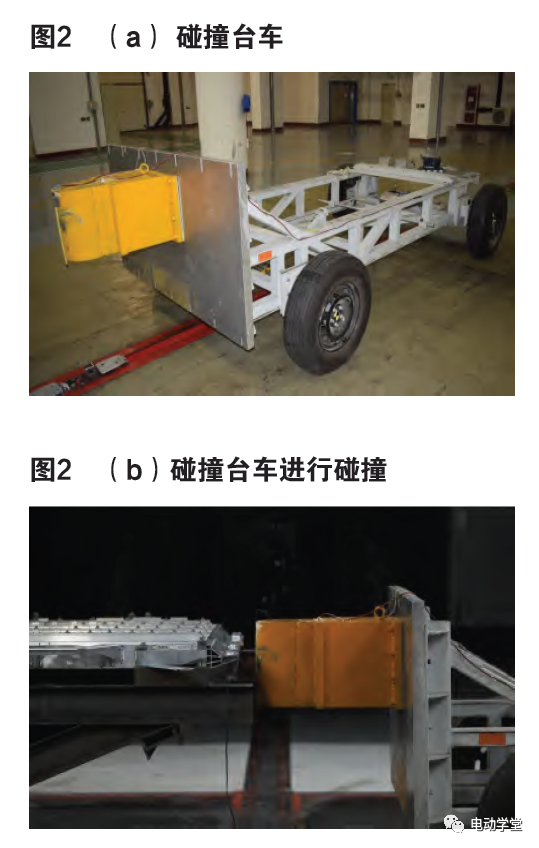 (3)碰撞能量可控的动态碰撞测试,假设以固定的碰撞深度,碰撞动力电池模组,测试动力电池模块碰撞加速度、碰撞力以及碰撞后电池模组状态。在实际测试中分别选取电池单体与电池模组作为研究对象,采用深度可控的碰撞方式,考察动力电池不同层级在动态碰撞中的情况。碰撞台车与实际碰撞情况如图2(a)-(b)。