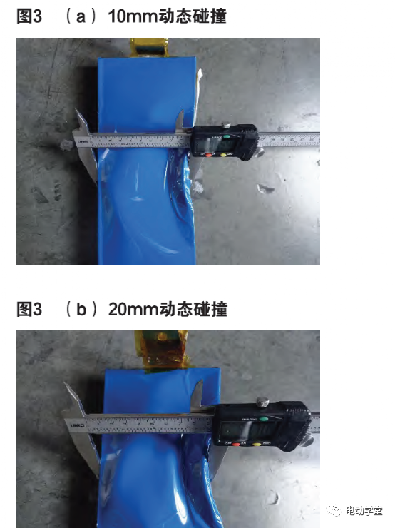 针对动力电池单体进行深度可控的动态碰撞测试,测试后形变如图,损伤形变往往是动力电池选取电池正负极进行深度的可控动态碰撞其所得结果如图3(a)-(b)。10mm与20mm动态碰撞电池没有发生起火爆炸、在30mm动态碰撞时电池发生了起火爆炸现象,具体根据试验中测试结果归纳整理如下: