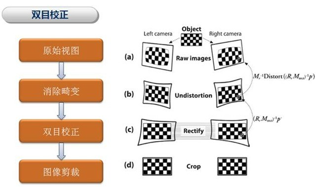 双目相机标定在OpenCV中提供了示例程序,本来是非常简单的事情,但是当标定自己的双目相机的时候却发现同样的程序最后标出的结果却很差劲,直接表现就是最后进行行对齐的时候获得图像根本不能看,所以从新梳理了双目标定的过程,并给出了对双目标定结果的应用,比如在ORB-SLAM中,双目模式是需要进行双目图像矫正和对齐的,这时就可以使用OpenCV提供的函数接口完成这个过程,其过程如图所示:
