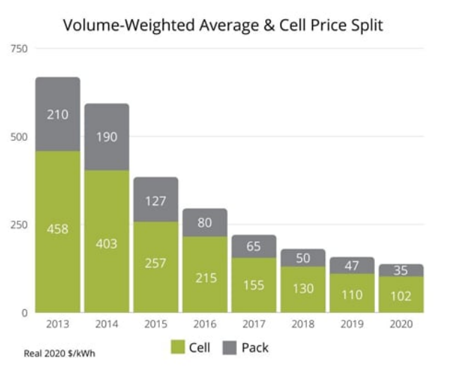 除了满足可持续发展要求外,锂离子电池还在重量和体积能量密度上具有卓越的优势,可显著减轻车辆的重量并节省空间。该技术还支持制动过程中回收更多能量(更高的动态充电接受度),提高动力系统效率。锂离子电池自放电率较低,循环稳定性优越,保质期长,因此需要更换的时间比等效铅酸电池更长。锂离子技术面临的挑战是低温性能,它不适合在寒冷天气条件下启动内燃机(ICE)。然而,最近由欧洲汽车制造商协会(EAMA)牵头的技术比较发现,锂离子冷起动性能与铅酸相当。尽管锂离子电池价格在2010年至2020年间下降了约89%,但成本问题依旧存在。