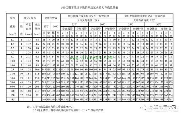 电线安全载流量表