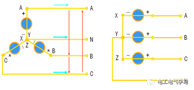 把三个绕组的末端 X, Y, Z 接在一起,把始端 A,B,C 引出来的接法叫星型联接,又叫Y联接。X、Y、Z接在一起的点称为Y联接对称三相电源的中性点,用N表示。