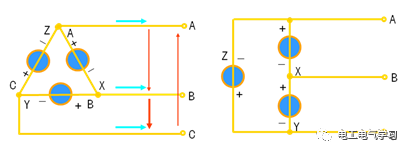 将三个绕组始末端顺序相接的接法叫三角形联接。 如下图所示