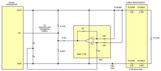 图2中的方框图详细给出了一个线性增加转换器输出电压,以补偿电缆损耗,并且保持电缆末端电压恒定的方法。这个解决方案增加了一个感测电阻器来监视输出电流。一个差分放大器增加感测电阻器上的电压,并且使用这个电压来将一个电流注入到控制器的反馈 (FB) 引脚内。如需进一步了解这个方法的详细信息,请参见“电源技巧:补偿电缆上的电压下降”。