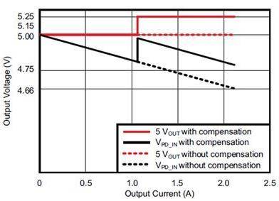 一个常见的解决方案就是尽可能地将典型值为5.0V的无负载输出设定电压提高到5.15V至5.20V(对于USB 3.0来说,最大值为5.25V)。这个解决方案在最大2.1A电流时提供足够(虽然仍旧为最小值)净空。而对于更高的负载电流,这个方法很快就会难以支撑。