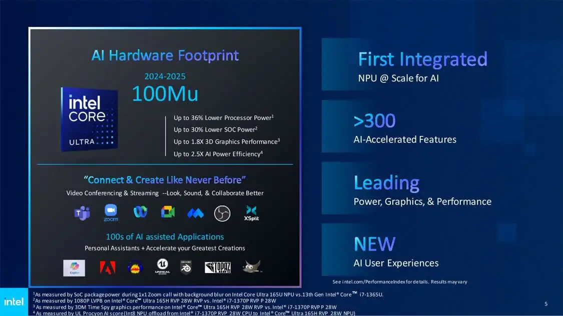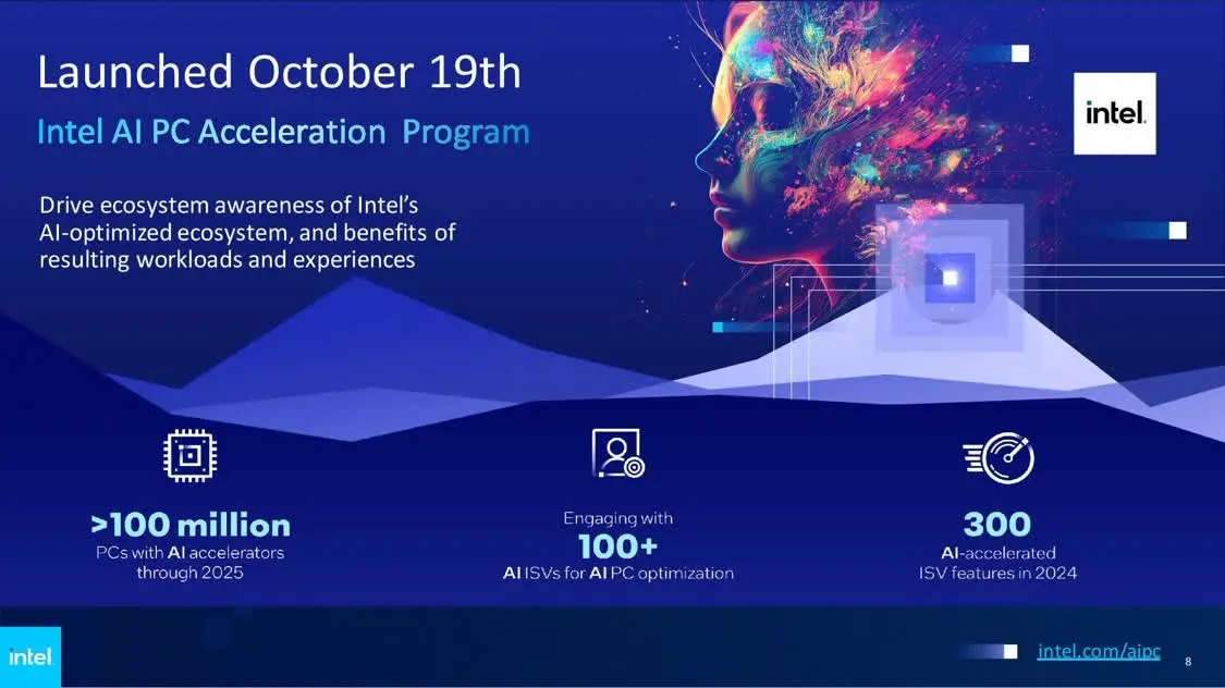 英特尔计划到 2025 年底交付超过 1 亿台带有 AI 加速器的 PC,该公司已经与 100 多家用于 PC 平台的 AI ISV 合作,并计划到 2024 年底在市场上推出 300 多个 AI 加速应用程序。
