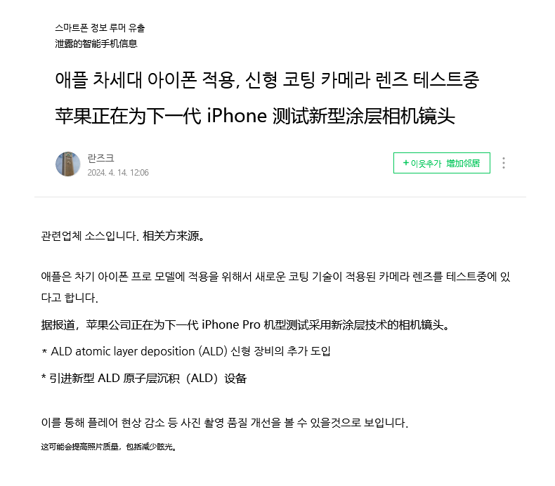 4 月 16 日消息,消息源 yeux1122 近日在其 Naver 博客上曝料,表示从苹果供应链处获悉,苹果正测试新的抗反射光学涂层技术,可以减少镜头炫光和鬼影等伪影,从而提高照片质量。